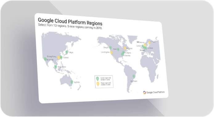 Google Cloud Platform Regions Select from 13 regions. 5 new regions coming in 2018. Finland Netherlands 3 2 London 3 3 3 Frankfurt Oregon 3 3 Montreal Iowa 4 Belgium 3 Los Angeles 3 N Virginia 3 Tokyo 3 S Carolina Hong Kong 3 3 Taiwan 3 Mumbai 2 Singapore 3 Current region and number of zones 3 Sydney São Paulo Future region and number of zones