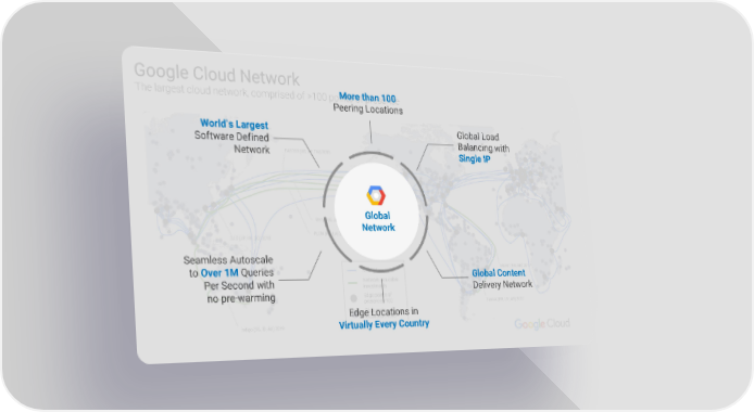 Google Cloud Network More than 100 The largest cloud network, comprised of >100 points of presence Peering Locations World’s Largest Global Load Software Defined Balancing with FASTER (US, JP, TW) 2016 Network Single IP Global Unity (US, JP) 2010 Network PLCN (HK, LA) 2019 SJC (JP, HK, SG) 2013 Seamless Autoscale Monet (US, BR) 2017 Network to Over 1M Queries Global Content Network sea cable Per Second with investments Junior (Rio, Santos) 2017 Delivery Network Edge points of no pre-warming presence >100 Tannat (BR, UY, AR) 2017 Edge node Edge Locations in locations >1000 Indigo (SG, ID, AU) 2019 Virtually Every Country