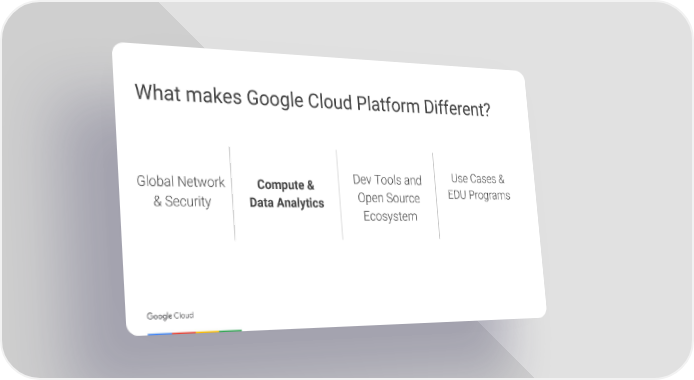 What makes Google Cloud Platform Different? Use Cases & Dev Tools and Global Network Compute & EDU Programs Open Source & Security Data Analytics Ecosystem