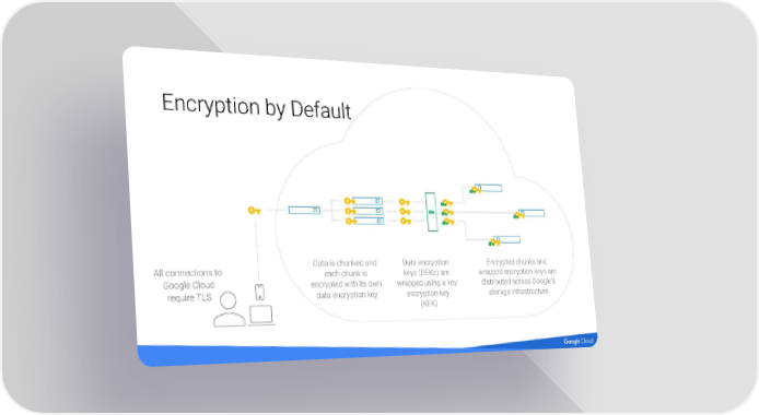 Encryption by Default Data is chunked and Data encryption Encrypted chunks and All connections to each chunk is keys (DEKs) are wrapped encryption keys are Google Cloud encrypted with its own wrapped using a key distributed across Google’s require TLS data encryption key encryption key storage infrastructure. (KEK)