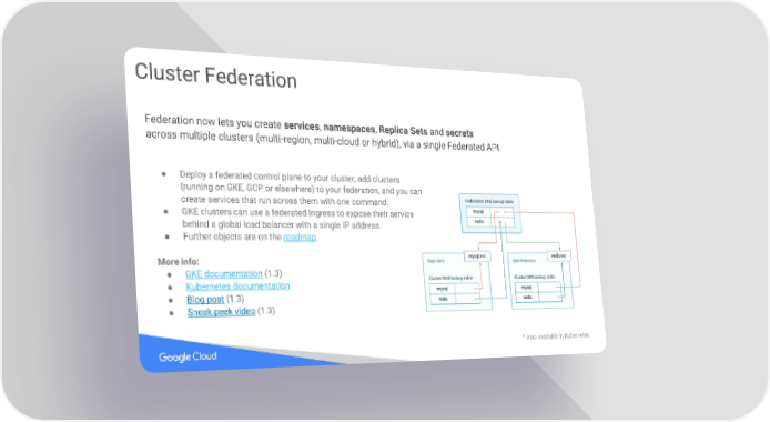 Cluster Federation Federation now lets you create services, namespaces, Replica Sets and secrets across multiple clusters (multi-region, multi-cloud or hybrid), via a single Federated API. ● Deploy a federated control plane to your cluster, add clusters (running on GKE, GCP or elsewhere) to your federation, and you can create services that run across them with one command. ● GKE clusters can use a federated Ingress to expose their service behind a global load balancer with a single IP address. ● Further objects are on the roadmap More info: ● GKE documentation (1.3) ● Kubernetes documentation ● Blog post (1.3) ● Sneak peek video (1.3) * Also available in Kubernetes