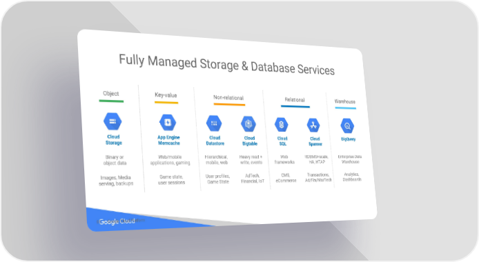 Fully Managed Storage & Database Services Key-value Relational Warehouse Object Non-relational Cloud App Engine Cloud Cloud Cloud Cloud BigQuery Storage Memcache Datastore Bigtable SQL Spanner Binary or Web/mobile Hierarchical, Heavy read + Web RDBMS+scale, Enterprise Data object data applications, gaming mobile, web write, events frameworks HA, HTAP Warehouse Images, Media Game state, User profiles, AdTech, CMS, Transactions, Analytics, serving, backups user sessions Game State Financial, IoT eCommerce Ad/Fin/MarTech Dashboards 00 | Google Cloud Platform