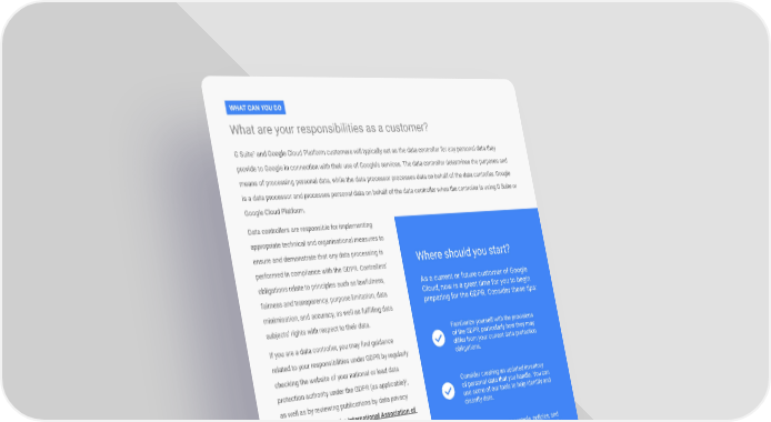 WHAT CAN YOU DO What are your responsibilities as a customer? 1 G Suite and Google Cloud Platform customers will typically act as the data controller for any personal data they provide to Google in connection with their use of Google’s services. The data controller determines the purposes and means of processing personal data, while the data processor processes data on behalf of the data controller. Google is a data processor and processes personal data on behalf of the data controller when the controller is using G Suite or Google Cloud Platform. Data controllers are responsible for implementing appropriate technical and organisational measures to ensure and demonstrate that any data processing is Where should you start? performed in compliance with the GDPR. Controllers’ obligations relate to principles such as lawfulness, As a current or future customer of Google fairness and transparency, purpose limitation, data Cloud, now is a great time for you to begin minimisation, and accuracy, as well as fulfilling data preparing for the GDPR. Consider these tips: subjects’ rights with respect to their data. Familiarize yourself with the provisions If you are a data controller, you may find guidance of the GDPR, particularly how they may related to your responsibilities under GDPR by regularly differ from your current data protection obligations. checking the website of your national or lead data 2 protection authority under the GDPR (as applicable) , Consider creating an updated inventory as well as by reviewing publications by data privacy of personal data that you handle. You can use some of our tools to help identify and associations such as the International Association of classify data. Privacy Professionals (IAPP). You should also seek independent legal advice relating Review your current controls, policies, and processes to assess whether they meet the to your status and obligations under the GDPR, as only requirements of the GDPR, and build a plan a lawyer can provide you with legal advice specifically to address any gaps. tailored to your situation. Please bear in mind that nothing on this website is intended to provide you with, Consider how you can leverage the existing data protection features on Google Cloud or should be used as a substitute for legal advice. as part of your own regulatory compliance framework. Conduct a review of G Suite or Google Cloud Platform third-party audit and certification materials to see how they may help with this exercise. Monitor updated regulatory guidance as it becomes available, and consult a lawyer to obtain legal advice specifically applicable 1 to your business circumstances. G Suite includes G Suite for Business and G Suite for Education. 2 We recommend you seek independent legal advice to determine your appropriate national or lead data protection authority. PAGE 2
