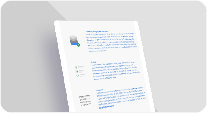 Availability, Integrity, and Resilience Google designs the components of our platform to be highly redundant. Google’s data centers are geographically distributed to minimize the effects of regional disruptions on global products such as natural disasters and local outages. In the event of hardware, software, or network failure, services are automatically and instantly shifted from one facility to another so that operations can continue without interruption. Our highly redundant infrastructure helps customers protect themselves from data loss. Testing Google conducts disaster recovery testing on an annual basis to provide a coordinated venue for infrastructure and application teams to test communication plans, fail- over scenarios, operational transition, and other emergency responses. All teams that participate in the disaster recovery exercise develop testing plans and post mortems which document the results and lessons learned from the tests. Encryption 010010101110 Google uses encryption to protect data in transit and at rest. Data in transit to 010101011110 G Suite is protected using HTTPS, which is activated by default for all users. 011011001001 G Suite and Google Cloud Platform services encrypt customer content stored at 011101101011 rest, without any action required from customers, using one or more encryption mechanisms. A detailed discussion of how we encrypt data can be found in our Encryption Whitepaper. Access Controls For Google employees, access rights and levels are based on job function and role, using the concepts of least-privilege and need-to-know to match access privileges to defined responsibilities. Requests for additional access follow a formal process that involves a request and an approval from a data or system owner, manager, or other executives, as dictated by Google’s security policies. Vulnerability Management We scan for software vulnerabilities using a combination of commercially available and purpose-built in-house tools, intensive automated and manual penetration testing, quality assurance processes, software security reviews, and external audits. We also rely on the broader security research community and greatly value their help identifying vulnerabilities in G Suite, Google Cloud Platform, and other Google products. Our Vulnerability Reward Program encourages researchers to report design and implementation issues that may put customer data at risk. PAGE 5