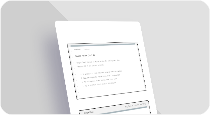 Big Data & Machine Learning Cloud OnBoard 1 2 1 Module review (2 of 2) 3 2 5 3 6 Google Cloud Storage is a good option for storing data that: 5 7 6 (select all of the correct options) 8 7 9 8 10 ❏ Is ingested in real-time from sensors and other devices 9 11 10 ❏ Will be frequently read/written from a compute node 12 11 ➔ May be required to be read at some later time 13 12 14 13 ➔ May be imported into a cluster for analysis 15 14 16 15 1716 17 18 Big Data & Machine Learning 1 2 Resources 3 5 Google Cloud Platform https://cloud.google.com/compute/ 6 Datacenters https://cloud.google.com/storage/ 7 8 Pricing https://cloud.google.com/pricing/ 9 10 Cloud Launcher https://cloud.google.com/launcher/ 11 Pricing Philosophy https://cloud.google.com/pricing/philosophy/ 12 13 14 15 16 17 21