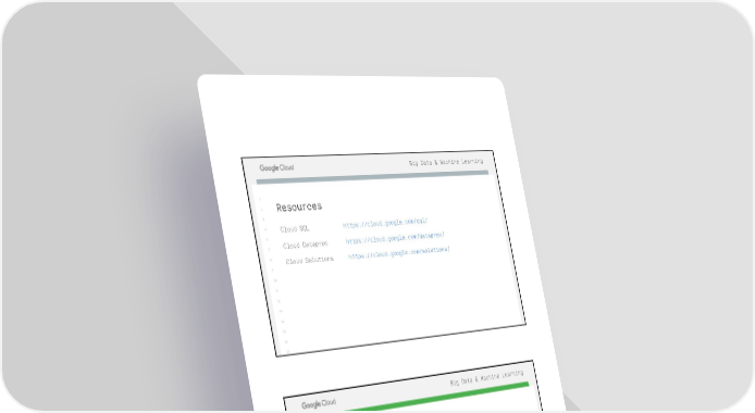 Big Data & Machine Learning 1 2 Resources 3 5 Cloud SQL https://cloud.google.com/sql/ 6 7 Cloud Dataproc https://cloud.google.com/dataproc/ 8 Cloud Solutions https://cloud.google.com/solutions/ 9 10 11 12 13 14 15 16 17 Big Data & Machine Learning 1 1 2 2 3 Cloud OnBoard 3 5 5 6 6 7 7 Scaling Data Analysis 8 8 9 9 10 10 11 11 12 12 Cloud OnBoard 13 13 14 14 15 15 16 Version #1.1 16 17 35