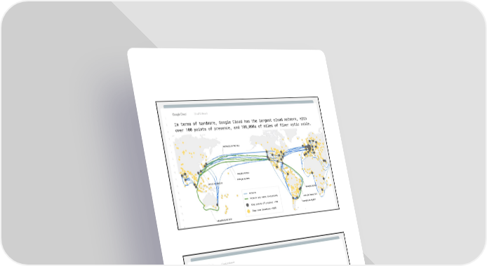 Big Data & Machine Learning Cloud OnBoard 1 2 In terms of hardware, Google Cloud has the largest cloud network, with 1 over 100 points of presence, and 100,000s of miles of fiber optic cable. 3 2 5 3 6 5 FASTER (US, JP, TW) 2016 7 6 8 7 9 8 10 9 11 Unity (US, JP) 2010 10 12 PLCN (HK, LA) 2019 11 SJC (JP, HK, SG) 2013 13 12 14 Monet (US, BR) 2017 13 Network 15 Network sea cable investments 14 Junior (Rio, Santos) 2017 16 Edge points of presence >100 15 Tannat (BR, UY, AR) 2017 1716 Edge node locations >1000 Indigo (SG, ID, AU) 2019 17 18 Big Data & Machine Learning Cloud OnBoard 1 2 The network connects 15 regions, 1 with 3 more coming 3 2 5 3 6 3 Finland 5 Netherlands 7 2 2 6 London 3 Oregon 3 3 3 Frankfurt 8 3 7 Iowa 4 3 Montreal Belgium 9 3 Los Angeles 3 3 N Virginia 8 Tokyo 3 S Carolina 10 9 HongKong 3 3 Taiwan 11 33 10 Mumbai 12 11 2 Singapore 13 12 14 13 Future region and 3 15 number of zones 14 3 Sydney Current region and São Paulo 16 15 number of zones 1716 17 18 4