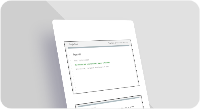Big Data & Machine Learning 1 2 Agenda 3 5 Fast random access 6 7 Warehouse and interactively query petabytes 8 Interactive, iterative development + Demo 9 10 11 12 13 14 15 16 17 Big Data & Machine Learning Cloud OnBoard 1 2 1 BigQuery is a fully managed data warehouse that lets you do ad-hoc 3 SQL queries on massive volumes of data 2 5 3 6 5 BigQuery Service 7 6 8 7 9 8 10 Project X Project Y 9 11 10 Dataset A Dataset B Dataset C Dataset D 12 11 13 Table 1 Table 1 Table 1 Table 1 12 14 13 15 14 Table 2 Table 2 Table 2 Table 2 16 15 1716 17 18 41