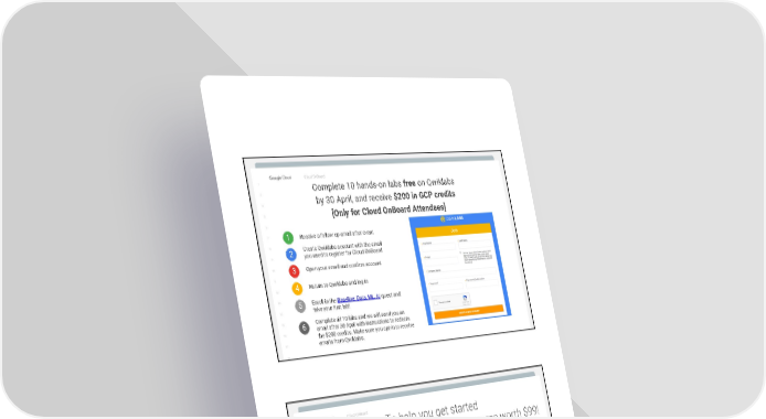 Big Data & Machine Learning Cloud OnBoard 1 Complete 10 hands-on labs free on Qwiklabs 2 1 by 30 April, and receive $200 in GCP credits 3 2 5 [Only for Cloud OnBoard Attendees] 3 6 5 7 1 Receive a follow up email after event 6 8 7 2 Create Qwiklabs account with the email 9 you used to register for Cloud OnBoard 8 10 Open your email and confirm account 9 3 11 Username 10 12 4 Return to Qwiklabs and log in 11 13 Password 12 5 Enroll in the Baseline: Data, ML, AI quest and 14 take your first lab! 13 15 14 6 Complete all 10 labs and we will send you an 16 email after 30 April with instructions to redeem 15 the $200 credits. Make sure you opt-in to receive 16 17 emails from Qwiklabs. 17 18 Big Data & Machine Learning Cloud OnBoard 1 To help you get started 2 1 3 Activate your voucher now for a free course worth $99! 2 5 3 Go to 6 1 5 https://www.coursera.org/voucher/CloudOnBoardML 7 6 8 7 9 Activate voucher and sign 8 2 up for a free account 10 9 11 10 12 11 Enroll in Serverless Data 13 Analysis with Google BigQuery 12 3 and Cloud Dataflow for Free 14 13 -Limited period offer! 15 14 Explore other Courses at 16 15 Coursera.org/Googlecloud 16 17 17 18 83