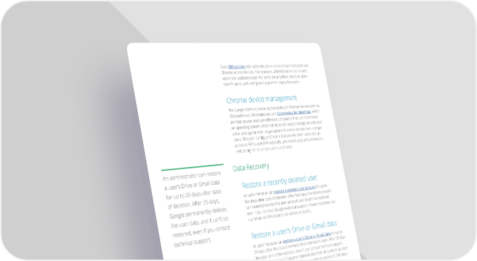 Over 280 policies help administrators control how employees use Chrome across devices. For example, administrators can enable automatic—updates—to—get—the—latest—security—ixes,—block—or—allow— speciic—apps,—and—conigure—support—for—legacy—browsers. Chrome device management The Google Admin Console applies policy to Chrome devices such as Chromebooks, Chromeboxes, and Chromebox for Meetings, which are—fast,—secure,—and—cost-efective—computers—that—run—Chrome—as— an operating system. Administrators can easily manage security and other settings for their organization’s Chrome devices from a single place.—They—can—conigure—Chrome—features—for—their—users,—set—up— access to VPNs and WiFi networks, pre-install apps and extensions, restrict sign-in to certain users, and more. An administrator can restore Data Recovery a user’s Drive or Gmail data Restore a recently deleted user for up to 25 days after date of deletion. After 25 days, An administrator can restore a deleted user account for up to Google permanently deletes ive—days—after—date—of—deletion.—After—ive—days,—the—Admin—console— permanently deletes the user account, and it can’t be restored, the user data, and it can’t be even if you contact Google technical support. Please note that only restored, even if you contact customer Administrators can delete accounts. technical support. Restore a user’s Drive or Gmail data An administrator can restore a user’s Drive or Gmail data for up to 25 days after the data is removed from the user’s trash. After 25 days, the data cannot be restored, even if you contact technical support. Google will delete all Customer-deleted data from its systems as soon as reasonably practicable and within a maximum period of 180 days. Security reports G Suite administrators have access to security reports that provide vital information on their organization’s exposure to data compromise. They can quickly discover which particular users pose security risks by—eschewing—2-step—veriication,—installing—external—apps,—or—sharing— 22