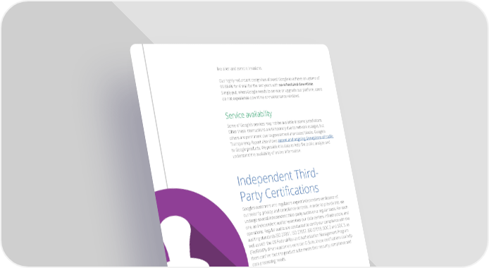 like alien and zombie invasions. Our highly redundant design has allowed Google to achieve an uptime of 99.984% for Gmail for the last years with no scheduled downtime. Simply put, when Google needs to service or upgrade our platform, users do not experience downtime or maintenance windows. Service availability Some of Google’s services may not be available in some jurisdictions. Often these interruptions are temporary due to network outages, but others are permanent due to government-mandated blocks. Google’s Transparency Report also shows recent and ongoing disruptions of traic to Google products. We provide this data to help the public analyze and understand the availability of online information. Independent Third- Party—Certiications Google’s—customers—and—regulators—expect—independent—veriication—of— our security, privacy, and compliance controls. In order to provide this, we undergo several independent third-party audits on a regular basis. For each one, an independent auditor examines our data centers, infrastructure, and operations. Regular audits are conducted to certify our compliance with the auditing standards ISO 27001, ISO 27017, ISO 27018, SOC 2 and SOC 3, as well as with the US Federal Risk and Authorization Management Program ”FedRAMP).—When—customers—consider—G—Suite,—these—certiications—can—help— them—conirm—that—the—product—suite—meets—their—security,—compliance—and— data processing needs. ISO 27001 ISO 27001 is one of the most widely recognized and accepted independent security standards. Google has earned it for the systems, technology, processes, and data centers that run G Suite. Our compliance with the international—standard—was—certiied—by—Ernst—&—Young—CertifyPoint,—an—ISO— certiication—body—accredited—by—the—Dutch—Accreditation—Council—”a—member— of—the—International—Accreditation—Forum,—or—IAF).—Our—ISO—27001—certiicate— and scoping document are available in here. 10