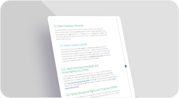 EU Data Protection Directive The Article 29 Working Party is an independent European advisory body focused on data protection and privacy. They have provided guidance on how to meet European data privacy requirements when engaging with cloud computing providers. Google provides capabilities and contractual commitments created to meet data protection recommendations provided by the Article 29 Working Party. EU model contract clauses In 2010, the European Commission approved model contract clauses as a means of compliance—with—the—requirements—of—the—Directive.—The—efect—of—this—decision—is—that—by— incorporating—certain—provisions—into—a—contract,—personal—data—can—low—from—those—subject— to the Directive to providers outside the EU or the European Economic Area. Google has a broad customer base in Europe. By adopting EU model contract clauses,—we’re—ofering— customers an additional option for compliance with the Directive. U.S. Health Insurance Portability and Accountability Act (HIPAA) G Suite supports our customers’ compliance with the U.S. Health Insurance Portability and Accountability—Act—”HIPAA),—which—governs—the—conidentiality—and—privacy—of—protected—health— information (PHI). Customers who are subject to HIPAA and wish to use G Suite with PHI must sign a business associate agreement (BAA) with Google. The BAA covers Gmail, Google Calendar, Google Drive, Google Sites and Google Vault. Additional information can be found in our HIPAA Implementation Guide. U.S. Family Educational Rights and Privacy Act (FERPA) More than 30 million students rely on G Suite for Education. G Suite for Education services comply with FERPA (Family Educational Rights and Privacy Act) and our commitment to do so is included in our agreements. Children’s Online Privacy Protection Act of 1998 (COPPA) Protecting children online is important to us. We contractually require G Suite for Education schools to obtain parental consent that COPPA calls for to use our services, and our services can be used in compliance with COPPA. 15