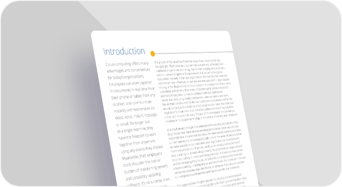 Introduction The growth of the cloud has thrust the issue of security and trust into Cloud—computing—ofers—many— advantages and conveniences the—spotlight.—That’s—because—cloud—services—operate—very—diferently—from— traditional on-premises technology. Rather than residing on local servers, for today’s organizations. content is now managed on Google servers that are part of our global Employees can work together data center network. In the past, organizations felt that they had complete control over how infrastructure was run and who operated it. Organizations in documents in real time from moving to the cloud will rely on cloud suppliers to manage the infrastructure, their phone or tablet from any operations, and delivery of services. In this new world, companies will still control company data, but via cloud-based tools and dashboards. location, and communicate Rather than only using desktop computers, users can now access work instantly with teammates via iles—on—their—personal—mobile—devices.—Customers—must—assess—whether—the— security controls and compliance of any cloud solution meet their individual video, voice, instant message, requirements. Customers must therefore understand how these solutions or email. No longer tied protect and process their data. The goal of this whitepaper is to provide an introduction to Google’s technology in the context of security and compliance. to a single machine, they have the freedom to work As a cloud pioneer, Google fully understands the security implications of the cloud model. Our cloud services are designed to deliver better security than together from anywhere, many traditional on-premises solutions. We make security a priority to protect using any device they choose. our own operations, but because Google runs on the same infrastructure that we—make—available—to—our—customers,—your—organization—can—directly—beneit— Meanwhile, their employers from these protections. That’s why we focus on security, and protection of don’t shoulder the cost or data is among our primary design criteria. Security drives our organizational structure, training priorities and hiring processes. It shapes our data centers burden of maintaining servers and the technology they house. It’s central to our everyday operations and and constantly updating disaster planning, including how we address threats. It’s prioritized in the way we handle customer data. And it’s the cornerstone of our account controls, software. It’s no surprise, then, our—compliance—audits—and—the—certiications—we—ofer—our—customers.—— that so many organizations This paper outlines Google’s approach to security and compliance for around the world are storing G—Suite,—our—cloud-based—productivity—suite.—Used—by—more—than—ive—million— their information and getting organizations worldwide, from large banks and retailers with hundreds of thousands of people to fast-growing startups, G Suite and G Suite for work done in the cloud.Education includes Gmail, Calendar, Groups, Drive, Docs, Sheets, Slides, Hangouts, Sites, Talk, Contacts and Google Vault. G Suite is designed to help teams—work—together—in—new,—more—eicient—ways,—no—matter—where—members— are located or what device they happen to be using. This whitepaper will be divided into two main sections: security and compliance. The security section will include details on organizational and technical controls regarding how Google protects your data. The second section on compliance will cover how your data is processed and details on how organizations can meet regulatory requirements. 1