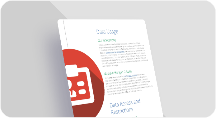 Data Usage Our philosophy G Suite customers own their data, not Google. The data that G Suite organizations and users put into our systems is theirs, and we do not scan it—for—advertisements—nor—sell—it—to—third—parties.—We—ofer—our—customers—a— detailed data processing amendment that describes our commitment to protecting customer data. Furthermore, if customers delete their data, we commit to deleting it from our systems within 180 days. Finally, we provide tools that make it easy for customer administrators to take their data with them if they choose to stop using our services, without penalty or additional cost imposed by Google. No advertising in G Suite There is no advertising in the G Suite Core Services, and we have no plans to change this in the future. Google does not collect, scan or use data in G Suite Core Services for advertising purposes. Customer administrators can restrict access to Non-Core Services from the Google Admin—console.—Google—indexes—customer—data—to—provide—beneicial— services,—such—as—spam—iltering,—virus—detection,—spellcheck—and—the—ability—to— search—for—emails—and—iles—within—an—individual—account. Data Access and Restrictions Administrative access To keep data private and secure, Google logically isolates each customer’s G Suite data from that of other customers and users, even when it’s stored on the same physical server. Only a small group of Google employees have access to customer data. For Google employees, access rights and levels are based on their job function and role, using the concepts of least-privilege and—need-to-know—to—match—access—privileges—to—deined—responsibilities.— Google employees are only granted a limited set of default permissions to access company resources, such as employee email and Google’s internal employee portal. Requests for additional access follow a formal process that involves a request and an approval from a data or system owner, manager, or other executives, as dictated by Google’s security policies. 12