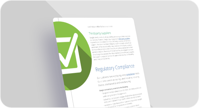 speciically—prohibited—by—law—or—court—order. Third-party suppliers Google directly conducts virtually all data processing activities to provide our services. However, Google may engage some third-party suppliers to provide services related to G Suite, including customer and technical support. Prior to onboarding third-party suppliers, Google conducts an assessment of the security and privacy practices of third-party suppliers to ensure they provide a level of security and privacy appropriate to their access to data and the scope of the services they are engaged to provide. Once Google has assessed the risks presented by the third-party supplier, the—supplier—is—required—to—enter—into—appropriate—security,—conidentiality,— and privacy contract terms. Regulatory Compliance Our customers have varying regulatory compliance needs. Our clients operate across regulated industries, including inance,—pharmaceutical—and—manufacturing. Google contractually commits to the following: • Google will maintain adherence to ISO 27001, ISO 27018 and SOC 2/3 audits during the term of the agreement; •—Deined—Security—Standards.—Google—will—deine—how—data—is—processed,— stored,—and—protected—through—speciic—deined—security—standards; •—Access—to—our—Data—Privacy—Oicer.—Customers—may—contact—Google’s— Data—Privacy—Oicer—for—questions—or—comments; • Data Portability. Administrators can export customer data in standard formats at any time during the term of the agreement. Google does not charge a fee for exporting data. Data processing amendment Google takes a global approach to our commitments on data processing. Google and many of our customers operate in a global environment. G Suite ofers—a—Data Processing Amendment and EU Model Contract Clauses to facilitate—compliance—with—jurisdictional-speciic—laws—or—regulations.—Your— organization can opt into our data processing amendment by following the instructions in our Help Center. 14