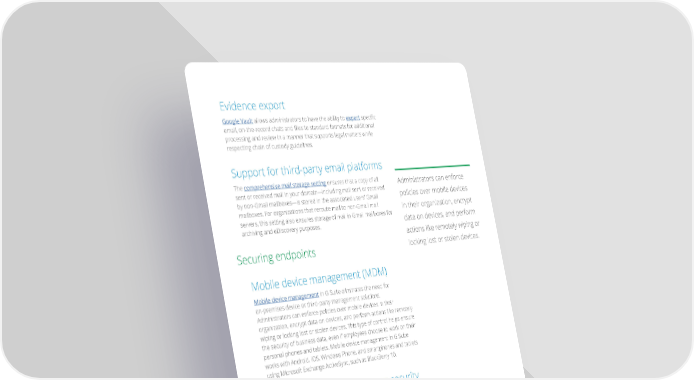 Evidence export Google Vault allows administrators to have the ability to export speciic— email,—on-the-record—chats—and—iles—to—standard—formats—for—additional— processing and review in a manner that supports legal matters while respecting chain of custody guidelines. Support for third-party email platforms The comprehensive mail storage setting ensures that a copy of all Administrators can enforce sent or received mail in your domain—including mail sent or received policies over mobile devices by non-Gmail mailboxes—is stored in the associated users’ Gmail mailboxes. For organizations that reroute mail to non-Gmail mail in their organization, encrypt servers, this setting also ensures storage of mail in Gmail mailboxes for data on devices, and perform archiving and eDiscovery purposes. actions like remotely wiping or Securing endpoints locking lost or stolen devices. Mobile device management (MDM) Mobile device management in G Suite eliminates the need for on-premises device or third-party management solutions. Administrators can enforce policies over mobile devices in their organization, encrypt data on devices, and perform actions like remotely wiping or locking lost or stolen devices. This type of control helps ensure the security of business data, even if employees choose to work on their personal phones and tablets. Mobile device management in G Suite works with Android, iOS, Windows Phone, and smartphones and tablets using Microsoft Exchange ActiveSync, such as BlackBerry 10. Policy-based Chrome browser security All of the tools and features in G Suite are best supported by Google Chrome. Administrators can apply security and usage policies across Windows, OSX, Linux, iOS, and Android. Chrome’s standard security features include Safe Browsing, sandboxing, and managed updates that protect users from malicious sites, viruses, malware, and phishing attacks. There are also measures in place to prevent cross- site scripting, which attackers can use to steal private data. G Suite administrators can deploy Google Chrome across their organization and customize it to meet their needs. 21