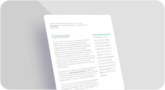 documents indiscriminately. Administrators can also choose to receive alerts when suspicious login activity occurs, indicating a possible security threat. Conclusion Data protection is more The protection of user data is a primary design consideration for all of than just security. Google Google’s infrastructure, applications and personnel operations. Protection of user data is far from being an afterthought or the focus of ofers—strong—contractual— occasional initiatives, it’s an integral part of what we do. We believe that commitments in our Data Google—can—ofer—a—level—of—protection—that—very—few—can—match.— Because protecting your data is part of our core business, Google can Processing Amendment to develop security innovations such as 2-step authentication and stronger make sure our customers encryption methods. We are able to make extensive investments in security,—resources—and—expertise—at—a—scale—that—few—can—aford.—Our—scale—of—maintain control over the operations and collaboration with the security research community enable data and how it is processed, Google to address vulnerabilities quickly or prevent them entirely. Google’s—security—and—operational—procedures—are—veriied—by—independent—including the assurance third-party auditors. that your data in the G Suite Data—protection—is—more—than—just—security,—Google—ofers—strong—contractual—Core Services is used for the commitments in our Data Processing Amendment to make sure our customers maintain control over the data and how it is processed, including purposes—speciied—in—your— the assurance that your data in the G Suite Core Services is used for the agreement, and not used in purposes—speciied—in—your—agreement,—and—not—used—for—advertising.——advertising. For these reasons and more over 5 million organizations across the globe, including 64 percent of the Fortune 500, trust Google with their most valuable asset: their information. Google will continue to invest in security, innovation—to—evolve—our—platform—to—allow—our—users—to—beneit—from—our— services in a secure and transparent manner. 23