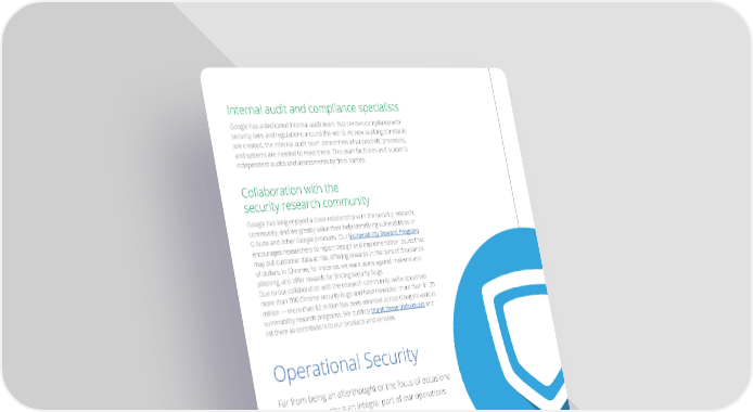 Internal audit and compliance specialists Google has a dedicated internal audit team that reviews compliance with security laws and regulations around the world. As new auditing standards are created, the internal audit team determines what controls, processes, and systems are needed to meet them. This team facilitates and supports independent audits and assessments by third parties. Collaboration with the security research community Google has long enjoyed a close relationship with the security research community, and we greatly value their help identifying vulnerabilities in G Suite and other Google products. Our Vulnerability Reward Program encourages researchers to report design and implementation issues that may—put—customer—data—at—risk,—ofering—rewards—in—the—tens—of—thousands— of dollars. In Chrome, for instance, we warn users against malware and phishing,—and—ofer—rewards—for—inding—security—bugs.— Due to our collaboration with the research community, we’ve squashed more than 700 Chrome security bugs and have rewarded more than $1.25 million — more than $2 million has been awarded across Google’s various vulnerability rewards programs. We publicly thank these individuals and list them as contributors to our products and services. Operational Security Far from being an afterthought or the focus of occasional initiatives, security is an integral part of our operations. Vulnerability management Google administrates a vulnerability management process that actively scans for security threats using a combination of commercially available and purpose-built in-house tools, intensive automated and manual penetration eforts,—quality—assurance—processes,—software—security—reviews—and—external— audits. The vulnerability management team is responsible for tracking and following up on vulnerabilities. Once a vulnerability requiring remediation has been—identiied,—it—is—logged,—prioritized—according—to—severity,—and—assigned—an— owner. The vulnerability management team tracks such issues and follows up frequently until they can verify that the issues have been remediated. Google also maintains relationships and interfaces with members of the security research community to track reported issues in Google services and open-source tools. More information about reporting security issues can be found at Google Application Security. 4