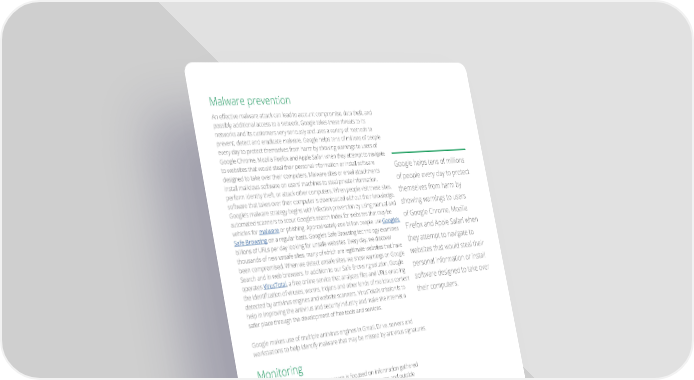 Malware prevention An—efective—malware—attack—can—lead—to—account—compromise,—data—theft,—and possibly additional access to a network. Google takes these threats to its networks and its customers very seriously and uses a variety of methods to prevent, detect and eradicate malware. Google helps tens of millions of people every day to protect themselves from harm by showing warnings to users of Google Chrome, Mozilla Firefox and Apple Safari when they attempt to navigate to websites that would steal their personal information or install softwareGoogle helps tens of millions designed to take over their computers. Malware sites or email attachmentsof people every day to protect install malicious software on users’ machines to steal private information, perform identity theft, or attack other computers. When people visit these sites,themselves from harm by software that takes over their computer is downloaded without their knowledge.showing warnings to users Google’s malware strategy begins with infection prevention by using manual and automated scanners to scour Google’s search index for websites that may beof Google Chrome, Mozilla vehicles for malware or phishing. Approximately one billion people use Google’s Firefox and Apple Safari when Safe Browsing on a regular basis. Google’s Safe Browsing technology examines billions of URLs per day looking for unsafe websites. Every day, we discoverthey attempt to navigate to thousands of new unsafe sites, many of which are legitimate websites that havewebsites that would steal their been compromised. When we detect unsafe sites, we show warnings on Google Search and in web browsers. In addition to our Safe Browsing solution, Googlepersonal information or install operates VirusTotal ,—a—free—online—service—that—analyzes—iles—and—URLs—enabling—software designed to take over the—identiication—of—viruses,—worms,—trojans—and—other—kinds—of—malicious—content— detected by antivirus engines and website scanners. VirusTotal’s mission is totheir computers. help in improving the antivirus and security industry and make the Internet a safer place through the development of free tools and services. Google makes use of multiple antivirus engines in Gmail, Drive, servers and workstations to help identify malware that may be missed by antivirus signatures. Monitoring Google’s security monitoring program is focused on information gathered from—internal—network—traic,—employee—actions—on—systems—and—outside— knowledge of vulnerabilities. At many points across our global network, internal—traic—is—inspected—for—suspicious—behavior,—such—as—the—presence— of—traic—that—might—indicate—botnet—connections.—This—analysis—is—performed— using—a—combination—of—open-source—and—commercial—tools—for—traic— capture and parsing. A proprietary correlation system built on top of Google technology also supports this analysis. Network analysis is supplemented by examining system logs to identify unusual behavior, such as attempted access of customer data. Google security engineers place standing search alerts on public data repositories to look for security incidents that might afect—the—company’s—infrastructure.—They—actively—review—inbound—security— reports and monitor public mailing lists, blog posts, and wikis. Automated network analysis helps determine when an unknown threat may exist and escalates—to—Google—security—staf,—and—network—analysis—is—supplemented—by— automated analysis of system logs. 5